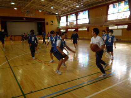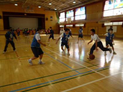 体育館で、「バスケットボール」の練習をしています。