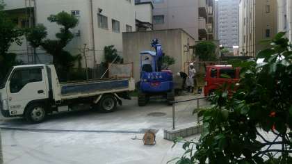 ゴミ捨て場横の仮通用門から出入りしてください。