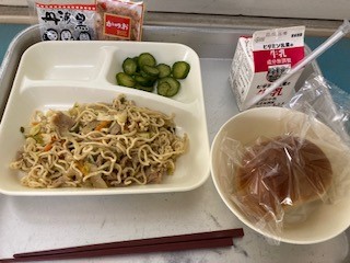 今日の給食は、和風焼きそば きゅうりのしょうがづけ いり黒豆 でした。