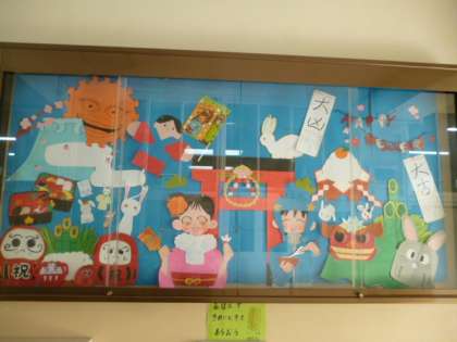 校長室前の掲示板には、お正月の雰囲気を醸し出した作品が飾られていますね。。