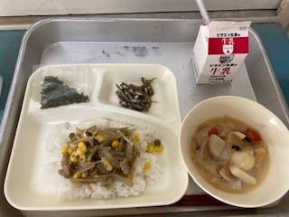 今日の給食は、きんぴらちらし ぞう煮 ごまめ でした。