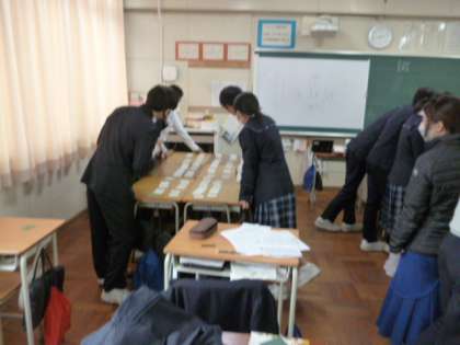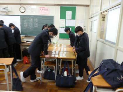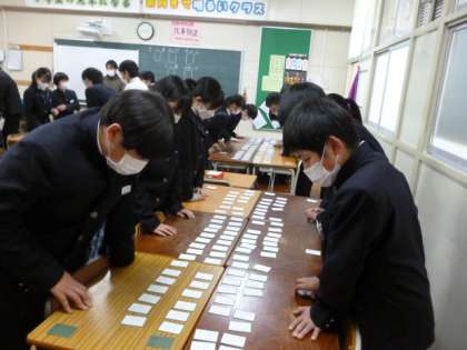 各クラスでは、各班で百人一首をひろげ、練習が始まりました。上の句を聞いて、いち早く