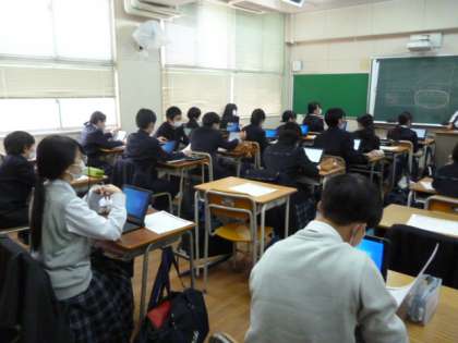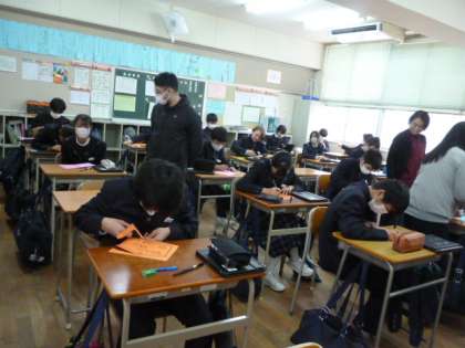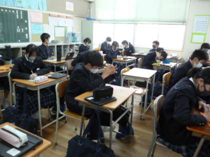 6時限目、総合の時間に、1年生は、チャレンジテストの生徒アンケートが行われました。また、1年の目標を絵馬に書きました。