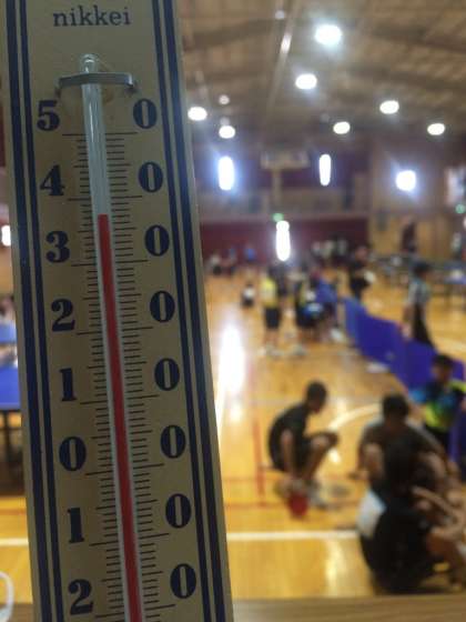 体育館の温度が37度を示す中、西中学校の女子ダブルスにおいて、西中対西中の決勝が行われおります。