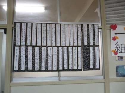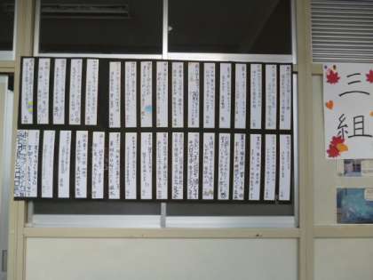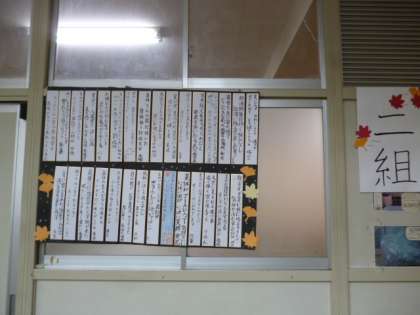 2年生の国語科では、短歌を学習しました。各クラスの教室前廊下には、生徒の作品が掲示されています。