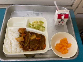 今日の給食は、ハヤシライス キャベツのバジル風味サラダ みかん(缶) でした。