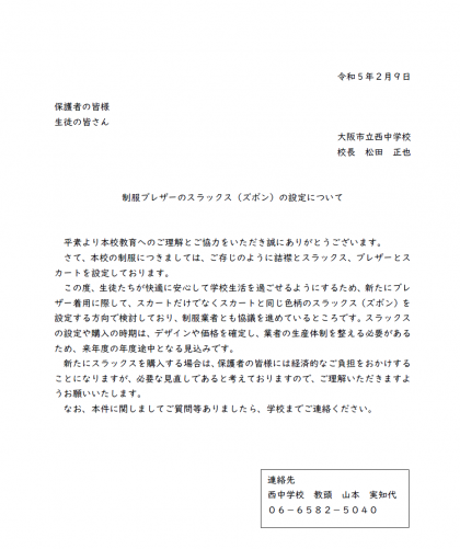 現在、ブレザーに組み合わせる制服はスカートだけですが、以下のように、来年度中(時期未定)にスラックスの設定を行う予定です。スラックスを購入する場合は、保護者の皆様には経済的なご負担をおかけすることになりますが、ご了承いただきますようお願いいたします。