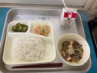 今日の給食は、すき焼き煮 もやしとささみのいためもの きゅうりのゆず風味 でした。