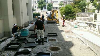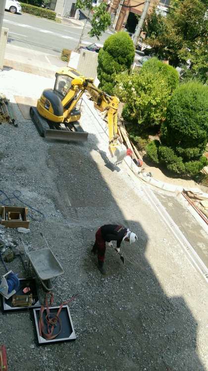 掘削工事を終え、今日は砕石や砂など敷き込み、突き固め作業に入りました。