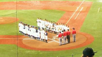で始められました。広い球場でそれぞれの学校ユニホームを着用し、プレ