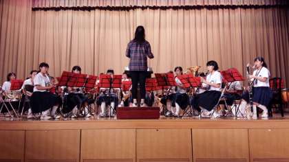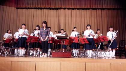 本校吹奏楽部は、昨年夏の高校野球のテーマソング「オモイダマ」と、ゆずの「夏色」の2曲を演奏しました。