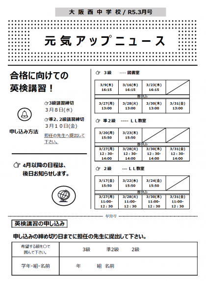 春休みの英検講習の案内です。申し込み締め切りが迫っています。有意義な春休みを過ごすためにも、積極的な参加を期待しています。