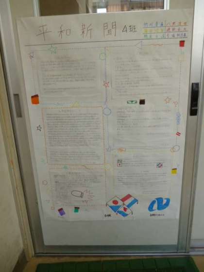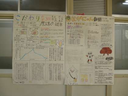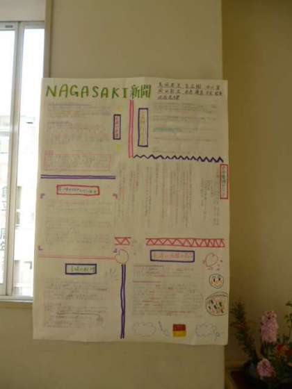 2年の教室前の廊下には、「長崎の調べ学習」で作成した新聞が張り出されています。