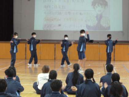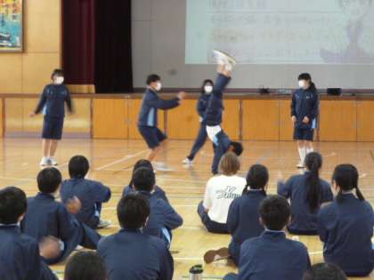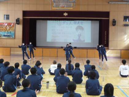 1年生の体育では、3学期に「ダンス」にとりくんできました。今日の6時限目 体育館では、日ごろ班で考え練習した「ダンス発表会」が開かれました。