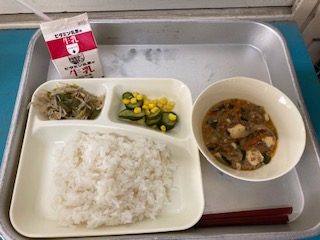 今日の給食は、マーボーどうふ きゅうりとコーンの甘酢あえ もやしとピーマンのごまいため でした。