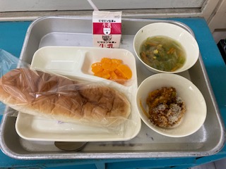 今日の給食は、じゃがいものミートグラタン レタスのスープ みかん(缶)でした。