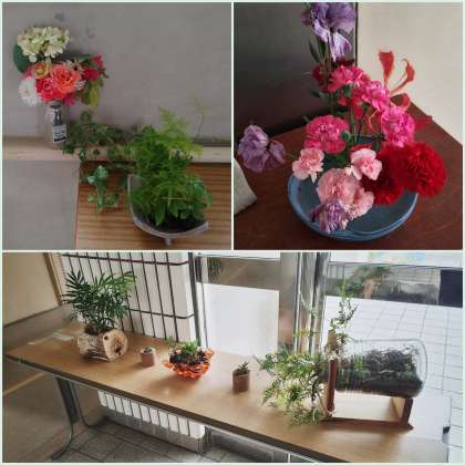 校舎内を歩くと、至る所に生け花や植物アートがあります。華道部の皆さんや管理作業員さんが玄関や校長室前、各教室前に飾ってくださっています。ふとした時に感じる花の香りや緑に心が和みます。