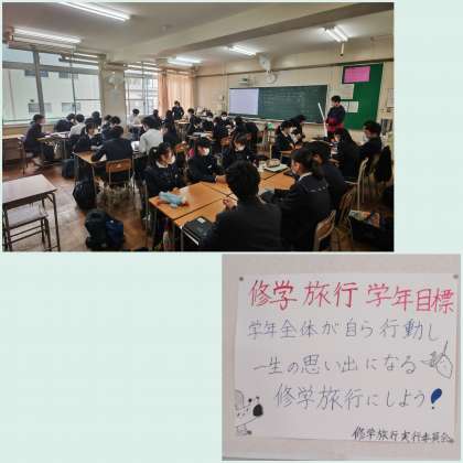 学年目標と合わせて、廊下には実行委員会によって修学旅行の目標や訪れる予定の場所の情報が貼り出されています。