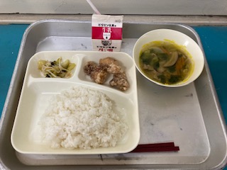 今日の給食は、鶏肉のからあげ、中華スープ、チンゲンサイともやしの甘酢あえ でした。