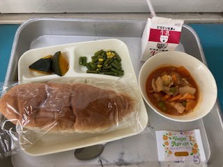 今日の給食は、ケチャップ煮、さんどまめとコーンのソテー、焼きかぼちゃの甘みつかけ でした。