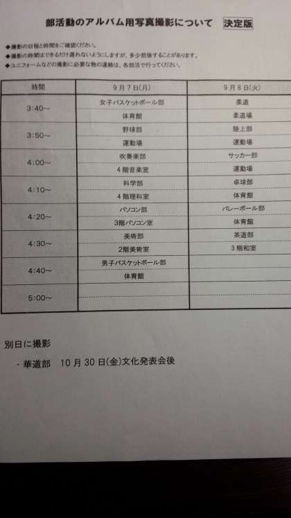 9月7日(月)8日(火)と2日間、部活動のアルバム用写真撮影が行われました。