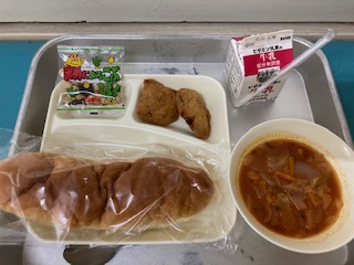 今日の給食は、一口トンカツ、ミネストローネ、豆こんぶ でした。