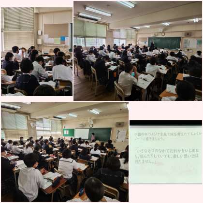 また、それぞれ学年の道徳の授業の中でいじめやいのちについて考えることを主題とした題材をもとに、気づいたことや考えたことを教室全体やグループの中で共有したりしました。