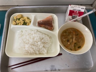 今日の給食は、あかうおのしょうゆだれかけ、みそ汁、えんどうの卵とじ。