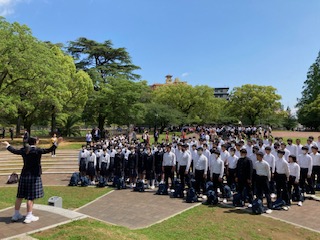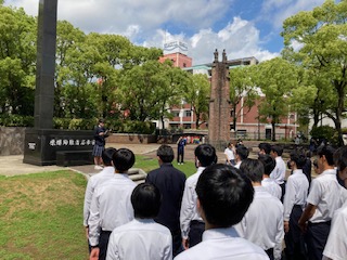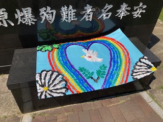 平和祈念公園でセレモニーを行いました。黙祷の後、平和宣言、みんなで作成した千羽鶴を奉納し、「空は今」を合唱しました。外国の方もセレモニーの様子をじっと見て、撮影している方もいました。