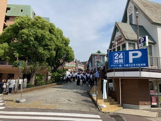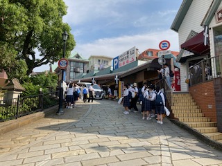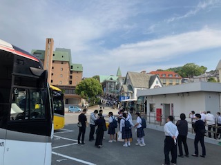班別の長崎市内研修を終え、お土産なども購入して、集合場所の長崎グラバー通り下の駐車場に集まって来ました。4時に宿舎に向けて出発します。