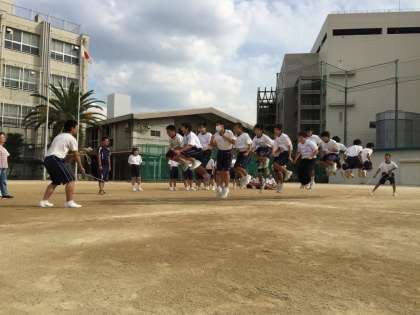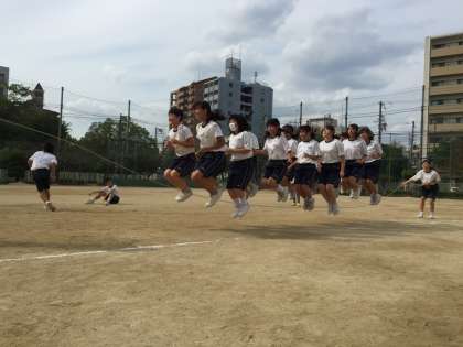 男女に分かれて全員でとび、男女の合計回数で競います。