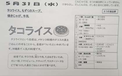 本日の給食は、タコライス、焼きじゃが、もずくのスープでした。