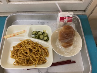 今日の給食は、カレースパゲッティ きゅうりのピクルス 棒チーズ でした。