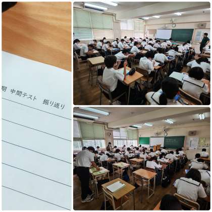 総合の時間を使って、中間テストの反省を行っています。中学校に入って初めての定期テストでしたが、うまくいったところとそうでなかったところに気が付いて次に生かせるといいですね。