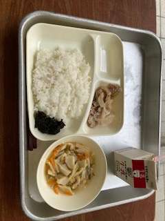 今日の給食は、豚肉の甘辛焼き 五目汁 のりのつくだ煮 でした。