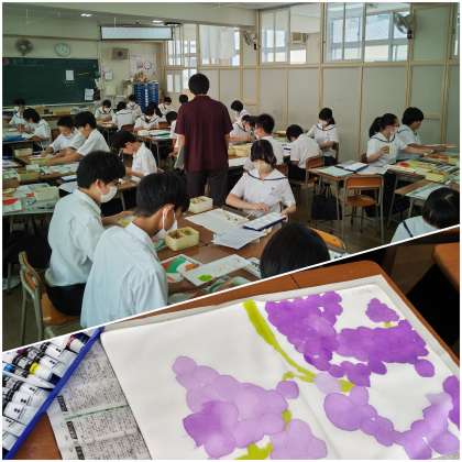 これまで行ってきた色彩の学習を活かして、オリジナルのランチョンマット制作をしています。みな思い思いに抽象化した食物を描いています。一人一人に色あいや濃淡が違い、とてもいい作品ができてきています。