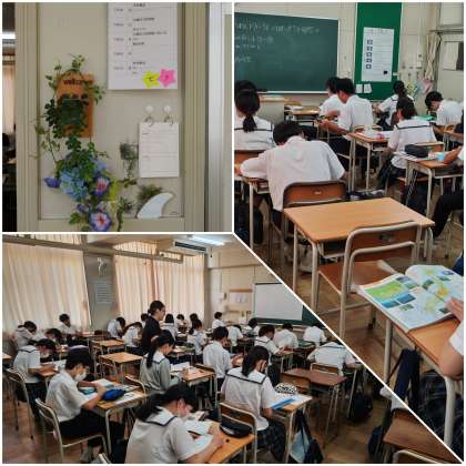 白地図に色を塗っていきながら、これまで学習した地理について復習しています。