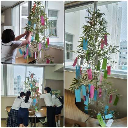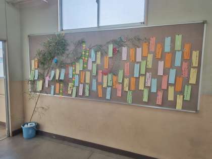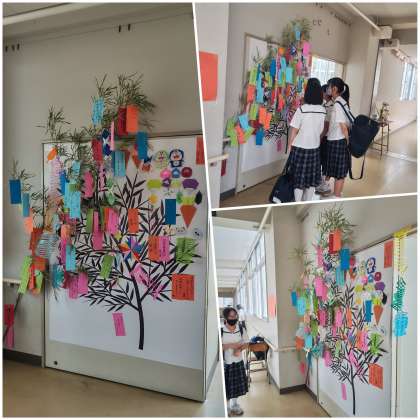 今週設置された笹に七夕ということで生徒たちは、それぞれ思い思いの願いを込めて短冊をくくりつけています。