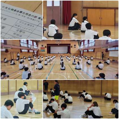 文化発表会での学年での取組みの概要説明があり、生徒はそれぞれ希望する役割分担をアンケートに記入しています。