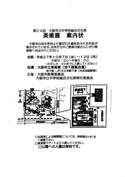 大阪市中学校総合文化祭の美術展が、本日7日から12日まで、天王寺にある大阪市立美術館で行われます。