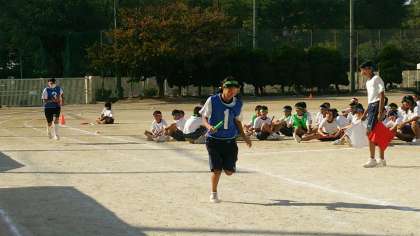 女子は100メートル、男子は200メートルでバトンをつなぎます。