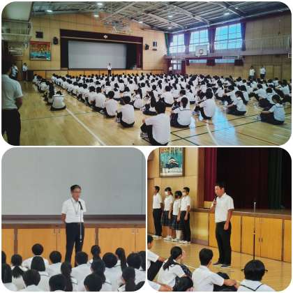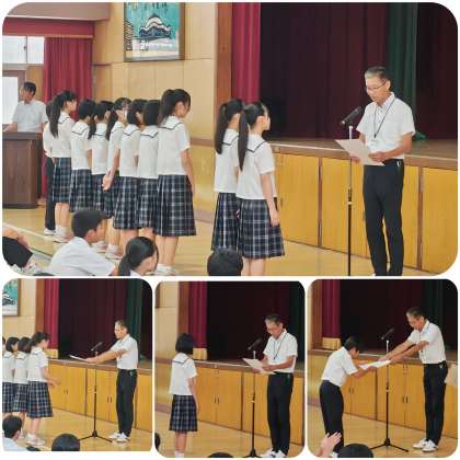 始業式では、校長先生より「長かった夏休みですが、2学期は行事や学習する内容等も多いので、体調面など少しずつ慣らしていきましょう。」と、お話がありました。また、夏休みに賞を獲得した吹奏楽部と卓球部の生徒たちの表彰がありました。