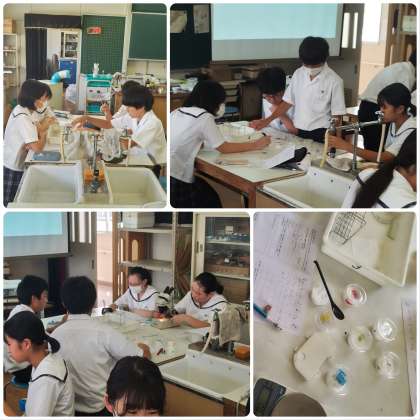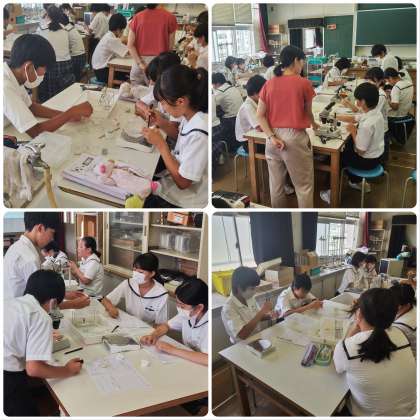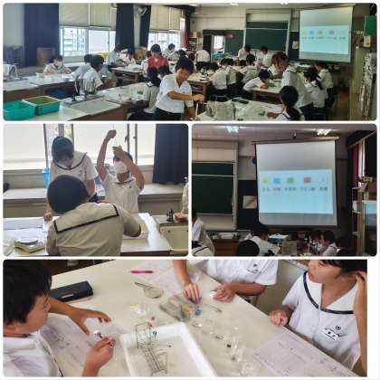 理科の授業では、「謎の物質Xの正体」を突き止めようと、これまでに学習した様々な方法から自分たちでどの方法を使うかを選んだり、仮説を立てています。次回はガスバーナーを使って、加熱するとそれぞれの物質にどんな変化が生じるのか、実験する予定です。どのグループも時間いっぱいまでしっかり調べています。