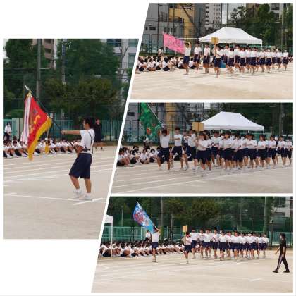 3学年合同で、体育大会実行委員長を中心に、体育大会の入場行進や開会式の練習を行っています。