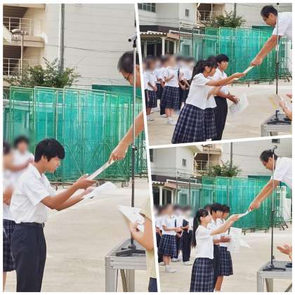 本日最終日を迎えた教育実習生が、生徒へ向けて挨拶を行いました。また、部活動で優秀な成績を収めた陸上部と吹奏楽部の生徒が表彰を受け、選挙管理委員会からは後期生徒会役員選挙へ向けた立候補者の紹介をしました。