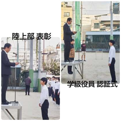 また、後期学級役員が決まり、その認証式と陸上部で好成績を残した生徒の表彰がありました。