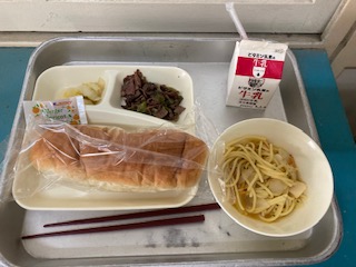今日の給食は、牛肉の香味焼き ほたて貝とトマトのスープスパゲッティ はくさいのピクルス でした。
