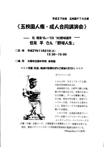 本年度は元プロ野球選手の住友平さんをお招きし、「野球人生」というテーマでお話いただきます。