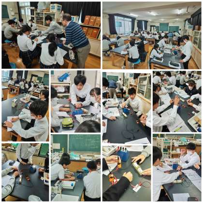 前時に学習した電流計の使い方を活用して、電池を直列、並列につないだ時の電圧の違いについて調べています。