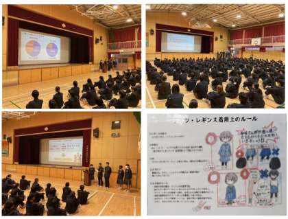 月曜朝の定例の全校集会で、生徒会役員から冬のタイツの着用に関しての校則の改定について説明がありました。タイツの着用については、生徒の中でも様々な意見がありましたが、長い時間をかけて話し合い、ルールを考えてくれました。その事を分かりやすく説明してくれました。生徒全員も真剣に説明を聞いていました。